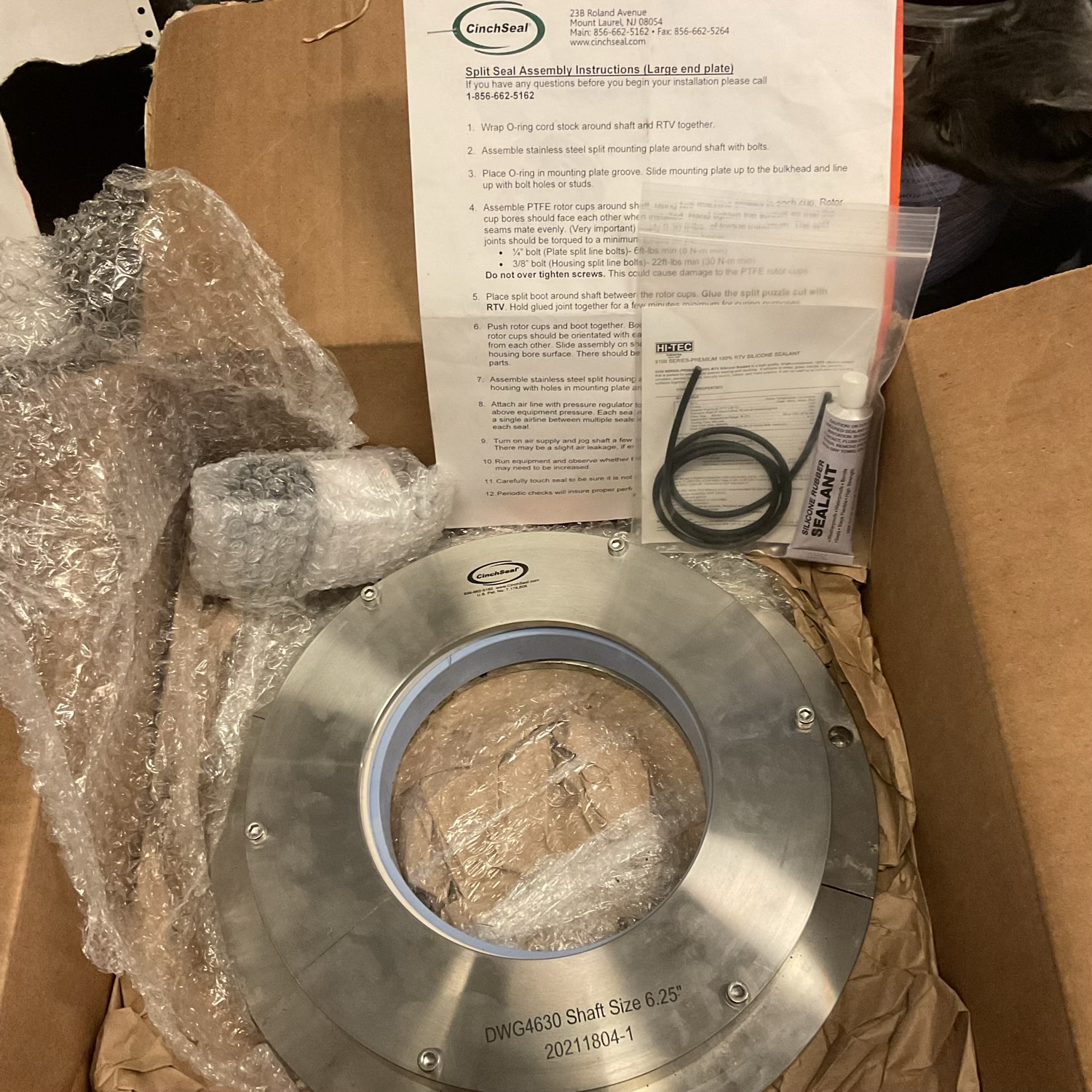 This listing is for one opened box DWG4630 CinchSeal 6.25″ bore Rotary Shaft Seal. The seal was purchased for an AMF dough mixer from Motion Industries in 2021. It is listed as used because it was unboxed and had clear fingerprints and dough smudges on the stainless components (we cleaned for pictures). The seal is new and was not installed. It does not come with the red silicone gasket (DWG4630-GP).