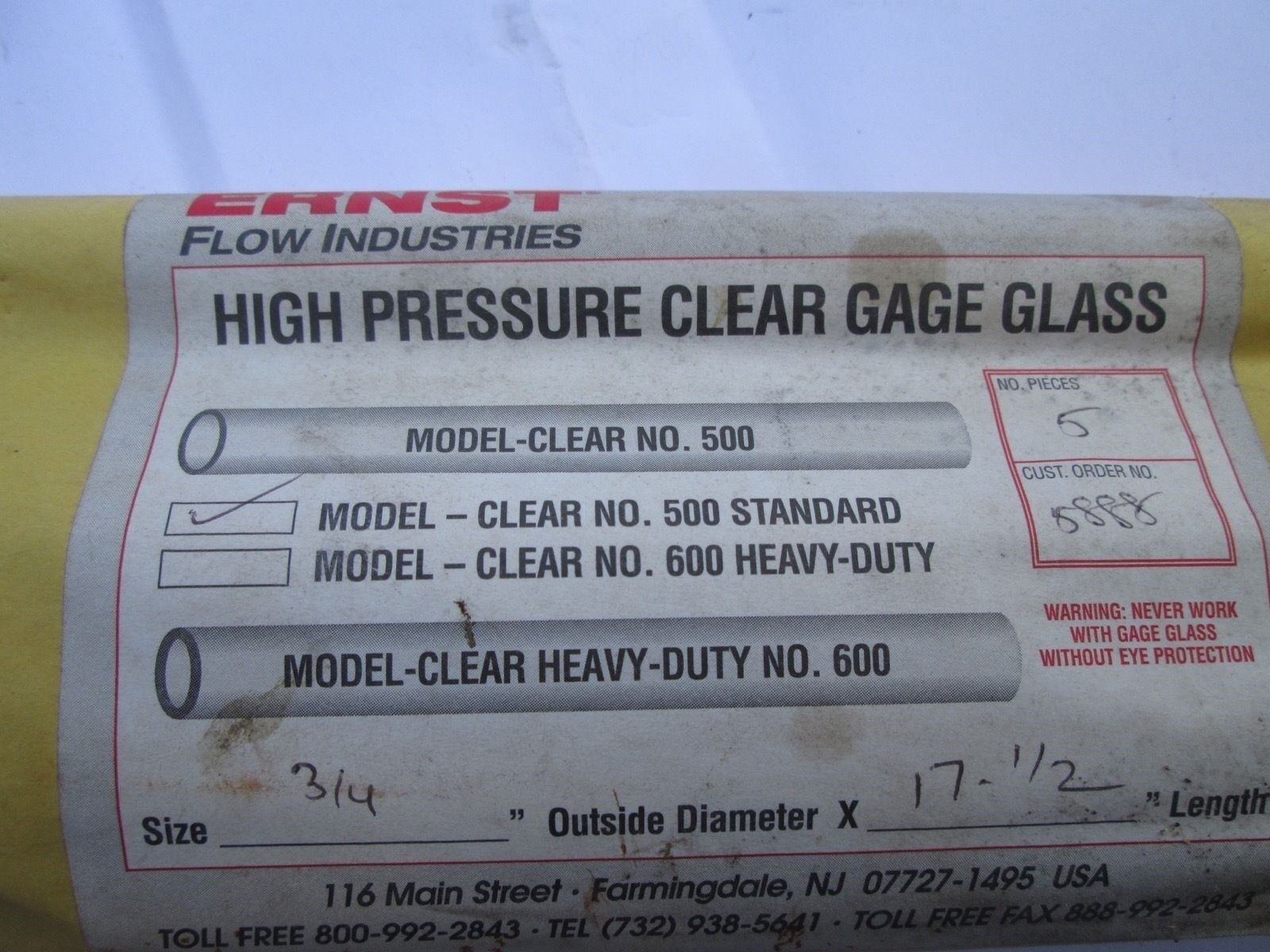 This listing is for a Ernst Flow Ind. High Pressure Gage Glass Clear No. 500 Standard 3/4″ x 17-1/2″.